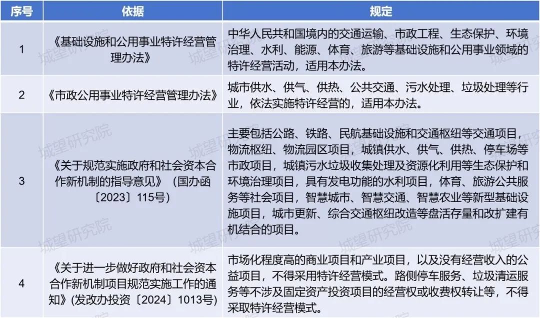 表2:特許經(jīng)營權(quán)適用范圍政策一覽