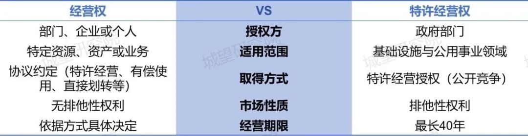 01 辨析:經(jīng)營權(quán) VS 特許經(jīng)營權(quán) 《基礎(chǔ)設(shè)施和公用事業(yè)特許經(jīng)營管理辦法》(2024年第17號令)僅對特許經(jīng)營模式做了定義,對特許經(jīng)營權(quán)可以拓展理解為由特定授權(quán)主體(通常為政府部門或其授權(quán)機構(gòu))依法授予企業(yè)或其他組織在一定期限、一定區(qū)域內(nèi),從事特定公共基礎(chǔ)設(shè)施建設(shè)、公用事業(yè)運營并獲得收益的專有權(quán)利。 02 匹配:哪些經(jīng)營權(quán)適用特許經(jīng)營模式?
