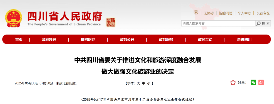 中共四川省委十二屆七次全體會(huì)議深入貫徹黨中央決策部署和習(xí)近平總書(shū)記重要指示精神,就推進(jìn)文化和旅游深度融合發(fā)展、做大做強(qiáng)文化旅游業(yè)進(jìn)行了研究,作出如下決定。一、堅(jiān)定推進(jìn)文化和旅游深度融合發(fā)展推進(jìn)文化和旅游深度融合發(fā)展,是以習(xí)近平同志為核心的黨中央著眼建設(shè)文化強(qiáng)國(guó)旅游強(qiáng)國(guó)作出的重大戰(zhàn)略部署,對(duì)于增強(qiáng)文化自信、服務(wù)人民群眾美好生活、促進(jìn)高質(zhì)量發(fā)展具有重大意義。習(xí)近平總書(shū)記深刻指出,文化產(chǎn)業(yè)和旅游產(chǎn)業(yè)密不可分,要堅(jiān)持以文塑旅、以旅彰文,把文旅產(chǎn)業(yè)真正打造成為支柱產(chǎn)業(yè)、民生產(chǎn)業(yè)、幸福產(chǎn)業(yè)。習(xí)近平總書(shū)記對(duì)四川文化和旅游發(fā)展寄予厚望、多次作出重要指示,賦予共建巴蜀文化旅游走廊的重大任務(wù),要求充分綻放獨(dú)特的自然生態(tài)之美、多彩人文之韻,譜寫(xiě)美麗中國(guó)的四川篇章。全省上下要堅(jiān)定貫徹習(xí)近平總書(shū)記重要指示精神,把文化和旅游深度融合發(fā)展擺在治蜀興川更加突出的位置,加快把文旅資源優(yōu)勢(shì)轉(zhuǎn)化為高質(zhì)量發(fā)展優(yōu)勢(shì),為譜寫(xiě)中國(guó)式現(xiàn)代化四川新篇章提供有力支撐。四川推進(jìn)文化和旅游深度融合發(fā)展,要以習(xí)近平新時(shí)代中國(guó)特色社會(huì)主義思想為指導(dǎo),全面貫徹黨的二十大和二十屆二中、三中全會(huì)精神,以建設(shè)習(xí)近平文化思想實(shí)踐新高地為引領(lǐng),牢牢把握社會(huì)主義先進(jìn)文化前進(jìn)方向,堅(jiān)持把社會(huì)效益放在首位、社會(huì)效益和經(jīng)濟(jì)效益相統(tǒng)一,堅(jiān)持文化為魂、旅游為體、科技賦能、保護(hù)優(yōu)先,著力做大做強(qiáng)文化旅游業(yè),深化“文旅+百業(yè)”“百業(yè)+文旅”,突出高能級(jí)主體培育和高品質(zhì)產(chǎn)品供給,推進(jìn)品牌、業(yè)態(tài)、服務(wù)和體制機(jī)制融合,努力走出一條具有中國(guó)特色、彰顯巴蜀魅力的文化和旅游深度融合發(fā)展新路子。四川推進(jìn)文化和旅游深度融合發(fā)展的總目標(biāo)是:到2027年,全省文化和旅游發(fā)展格局進(jìn)一步優(yōu)化,引育一批競(jìng)爭(zhēng)力和帶動(dòng)力強(qiáng)的文旅鏈主企業(yè),形成一批具有四川特色和優(yōu)勢(shì)的文旅融合業(yè)態(tài),文化及相關(guān)產(chǎn)業(yè)增加值、旅游總花費(fèi)分別達(dá)到3800億元、2萬(wàn)億元左右,文旅產(chǎn)業(yè)成為戰(zhàn)略性支柱產(chǎn)業(yè)。到2030年,文化和旅游深度融合發(fā)展體制機(jī)制更加健全,巴蜀文化影響力、四川旅游吸引力、文旅產(chǎn)業(yè)競(jìng)爭(zhēng)力顯著提升,文化強(qiáng)省旅游強(qiáng)省建設(shè)邁上新臺(tái)階。(一)建設(shè)世界級(jí)文旅地標(biāo)。擴(kuò)大標(biāo)志性品牌國(guó)際影響力,提升三星堆—金沙、九寨溝—黃龍、大熊貓、峨眉山—樂(lè)山大佛、青城山—都江堰、翠云廊—?jiǎng)﹂T關(guān)品牌知名度,培育若爾蓋濕地、稻城亞丁等世界級(jí)文旅新地標(biāo),打造享譽(yù)全球、來(lái)川必游的文旅旗艦項(xiàng)目。打造世界級(jí)文旅風(fēng)景道,高標(biāo)準(zhǔn)建設(shè)國(guó)道318/317中國(guó)最美景觀大道,打造藏羌彝民族風(fēng)情、蜀道三國(guó)文化、大巴山—嘉陵江紅色文化、岷江生態(tài)文化、天府大道城市文化等主題文旅風(fēng)景道,推出具有全球吸引力的精品線路。(二)做靚特色文旅名片。實(shí)施天府文藝名作高峰計(jì)劃,持續(xù)打造“文藝川軍”品牌,建設(shè)一批文藝創(chuàng)作基地、網(wǎng)絡(luò)視聽(tīng)和影視產(chǎn)業(yè)園區(qū),鼓勵(lì)開(kāi)展網(wǎng)絡(luò)文學(xué)、科幻文學(xué)、數(shù)字文娛、游戲動(dòng)漫等領(lǐng)域創(chuàng)作,扶持和推出一批文學(xué)、影視、舞臺(tái)藝術(shù)、視覺(jué)藝術(shù)優(yōu)質(zhì)作品。深化文旅名城建設(shè),支持成都增強(qiáng)極核帶動(dòng)作用、加快建設(shè)世界文化名城和世界旅游名城,支持自貢、攀枝花、德陽(yáng)、廣元、樂(lè)山、南充、宜賓建設(shè)國(guó)際旅游城市,加快建設(shè)區(qū)域旅游中心城市和特色旅游城市,提升建設(shè)天府旅游名縣。做強(qiáng)巴蜀名人文旅品牌,建好用好四川名人館,加強(qiáng)偉人將帥故里、革命烈士和歷史名人紀(jì)念設(shè)施保護(hù)利用,推進(jìn)三蘇故里文化旅游片區(qū)建設(shè),協(xié)同打造“東坡行旅”中國(guó)文物主題游徑。打造“川字號(hào)”文旅名品,圍繞標(biāo)志性文化知識(shí)產(chǎn)權(quán)(IP)推進(jìn)文創(chuàng)產(chǎn)品設(shè)計(jì)、制造、服務(wù)全鏈發(fā)展,加強(qiáng)文旅領(lǐng)域知識(shí)產(chǎn)權(quán)保護(hù)。擦亮川菜金字招牌,發(fā)布四川美食旅游地圖,辦好世界川菜大會(huì),支持成都、樂(lè)山等建設(shè)世界美食之都。深度開(kāi)發(fā)國(guó)家地理標(biāo)志產(chǎn)品,做優(yōu)川酒、川茶、川果、川竹、川藥等特色產(chǎn)品,培育“煙火里·慢生活”休閑文旅品牌。(三)實(shí)施巴蜀文旅全球推廣計(jì)劃。建強(qiáng)四川文