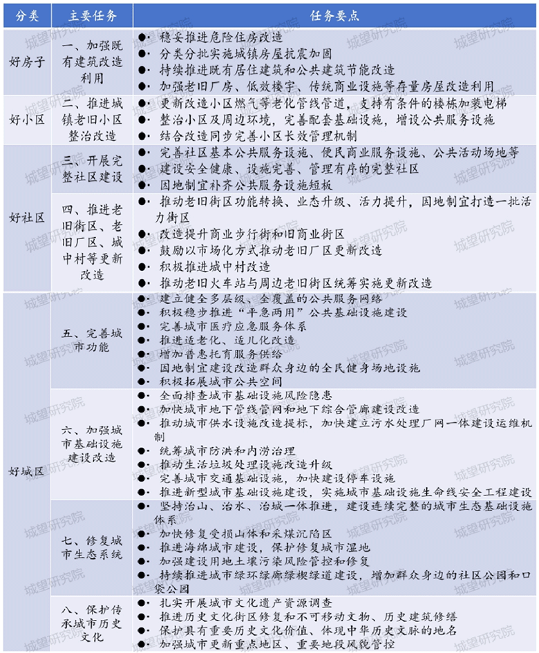 根據(jù)《意見》,城市更新任務(wù)細(xì)分為八大領(lǐng)域(表1),突破了傳統(tǒng)的碎片化思維,推進(jìn)“好房子、好小區(qū)、好社區(qū)、好城區(qū)”四好建設(shè),形成從單體建筑到城市生態(tài)的立體化治理格局。