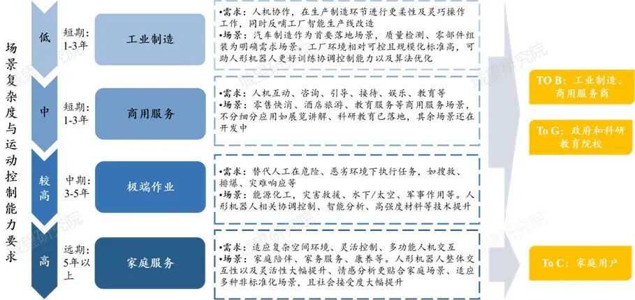 家庭服務(wù)被視為人形機器人應(yīng)用的遠期目標(biāo),場景涉及非標(biāo)準(zhǔn)化生活環(huán)境,對人形機器人高隨機性、復(fù)雜性場景運動控制要求較高。預(yù)計隨著在工業(yè)與商業(yè)場景中持續(xù)積累數(shù)據(jù)并優(yōu)化系統(tǒng),人形機器人將逐步實現(xiàn)能力迭代,最終進入家庭應(yīng)用領(lǐng)域,開拓面向消費者的市場。
