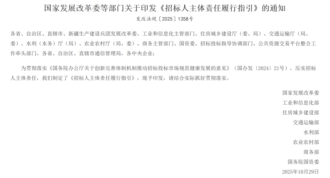 落實(shí)《政府工作報(bào)告》關(guān)于改革完善招標(biāo)投標(biāo)體制機(jī)制的部署要求,為引導(dǎo)和督促招標(biāo)人落實(shí)主體責(zé)任,提高招標(biāo)投標(biāo)活動(dòng)規(guī)范化科學(xué)化水平,近日,國(guó)家發(fā)展改革委、工業(yè)和信息化部、住房城鄉(xiāng)建設(shè)部、交通運(yùn)輸部、水利部、農(nóng)業(yè)農(nóng)村部、商務(wù)部、國(guó)務(wù)院國(guó)資委等8部門聯(lián)合印發(fā)了《國(guó)家發(fā)展改革委等部門關(guān)于印發(fā)〈招標(biāo)人主體責(zé)任履行指引〉的通知》(發(fā)改法規(guī)〔2025〕1358號(hào),以下簡(jiǎn)稱《指引》)。