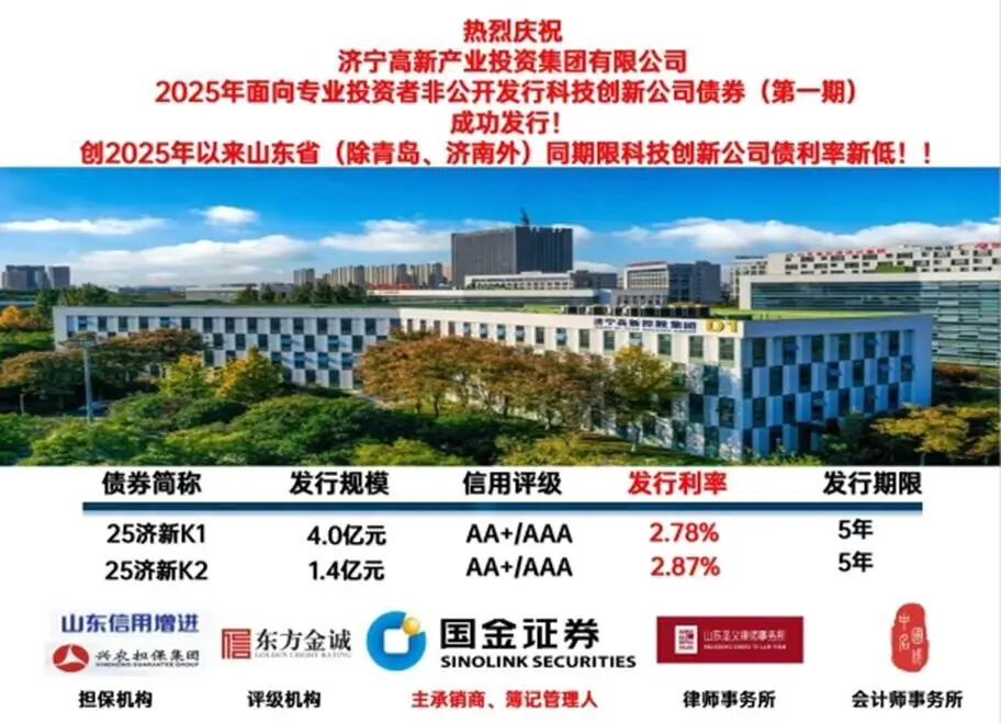 濟寧高新控股集團旗下高新產投集團成功發行第一期5.4億元5年期科技創新公司債券,創2025年以來山東省(除濟南、青島外)同期限科技創新公司債利率新低!