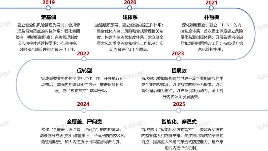 2019年,國(guó)務(wù)院國(guó)資委發(fā)布《關(guān)于加強(qiáng)中央企業(yè)內(nèi)部控制體系建設(shè)與監(jiān)督工作的實(shí)施意見(jiàn)》,首次明確提出“強(qiáng)內(nèi)控、防風(fēng)險(xiǎn)、促合規(guī)”的三位一體目標(biāo),建立健全“以風(fēng)險(xiǎn)管理為導(dǎo)向、合規(guī)管理監(jiān)督為重點(diǎn)”的內(nèi)控體系。此后,為持續(xù)深化該項(xiàng)工作,國(guó)務(wù)院國(guó)資委每年均發(fā)布《關(guān)于做好中央企業(yè)內(nèi)部控制體系建設(shè)與監(jiān)督工作有關(guān)事項(xiàng)的通知》,推動(dòng)中央企業(yè)內(nèi)控體系建設(shè)形成穩(wěn)步迭代、持續(xù)完善的進(jìn)化軌跡(圖1)。