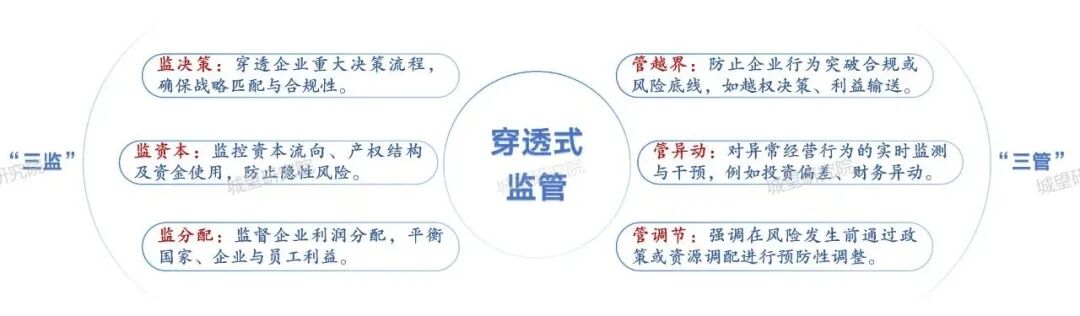 穿透式監(jiān)管,“穿透式”是手段,“監(jiān)管”是目的,以“三監(jiān)三管”為重點(diǎn),聚焦國(guó)有資產(chǎn)運(yùn)營(yíng)全級(jí)次、全鏈條、全過(guò)程、全要素的監(jiān)管。