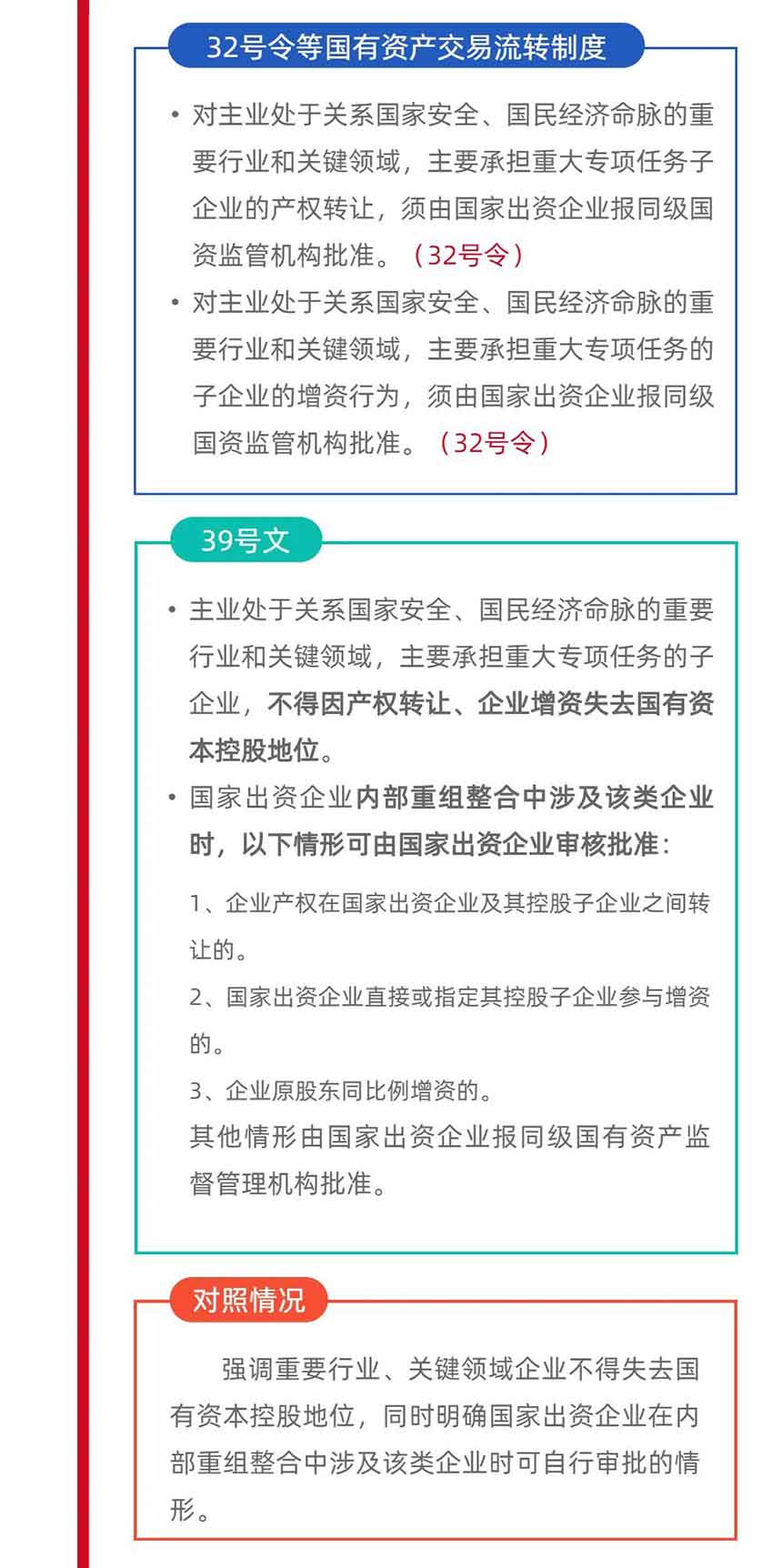 二是強調重要行業、關鍵領域企業不得失去國有資本控股地位,同時明確國家出資企業在內部重組整合中涉及該類企業時可自行審批的情形;