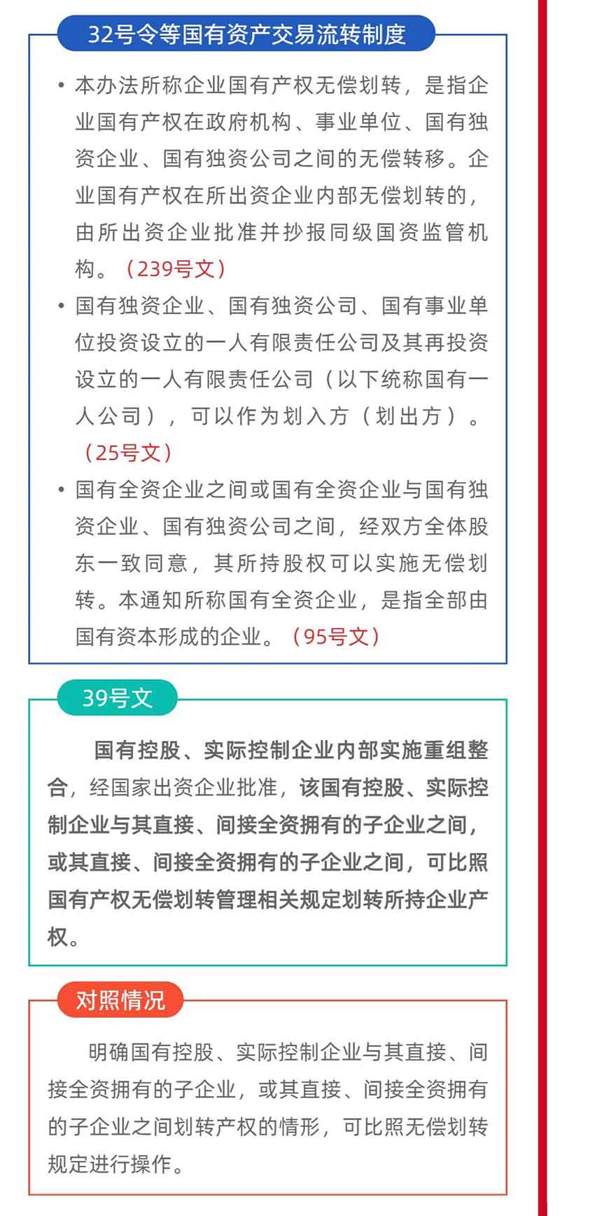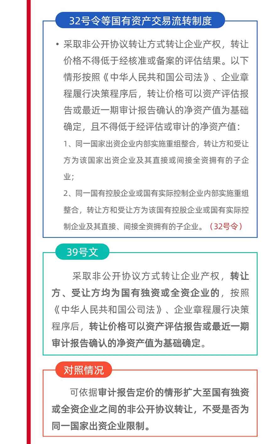 四是將可依據審計報告定價的情形擴大至國有獨資或全資企業之間的非公開協議轉讓,不受是否為同一國家出資企業限制;五是明確國有控股、實際控制企業與其直接、間接全資擁有的子企業,或其直接、間接全資擁有的子企業之間劃轉所持企業產權,可比照無償劃轉規定進行操作。