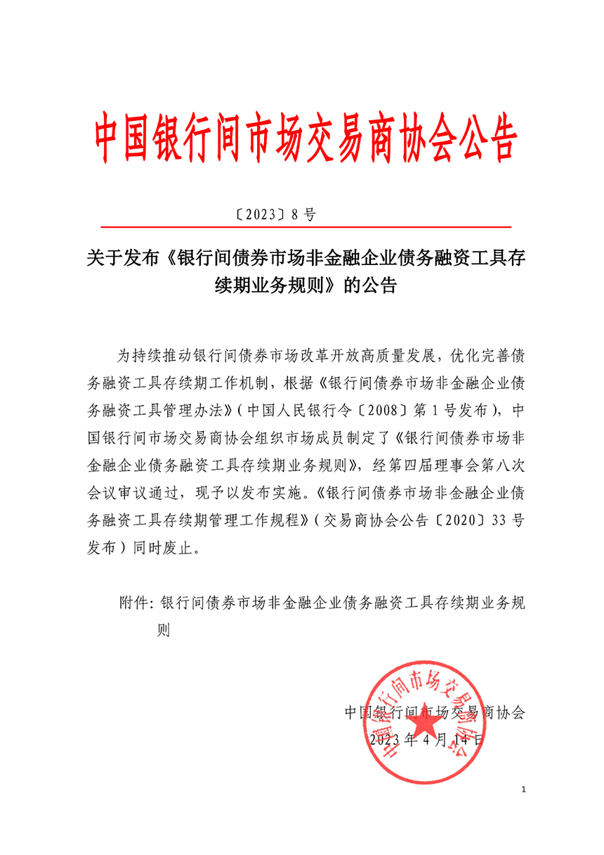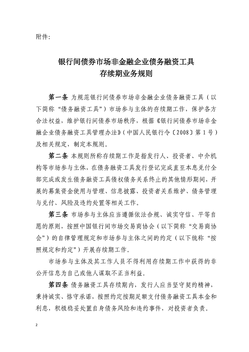 交易商協會官網披露,交易商協會于2023年4月20日發布《銀行間債券市場非金融企業債務融資工具存續期業務規則》(以下簡稱《存續期業務規則》),并于發布之日起施行。《存續期業務規則》是規范債務融資工具發行人、主承銷商、受托管理人等各類市場參與主體開展存續期工作的基礎性制度,旨在清晰界定各類參與主體的職責定位、工作內容、權利義務。